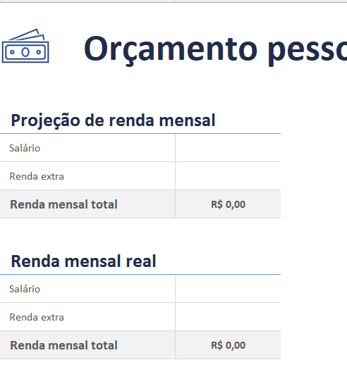 O primeiro bloco é composto da nossa renda mensal, seu salário, seus recebimentos, tudo que entra efetivamente em sua conta precisará ser lançado aqui.