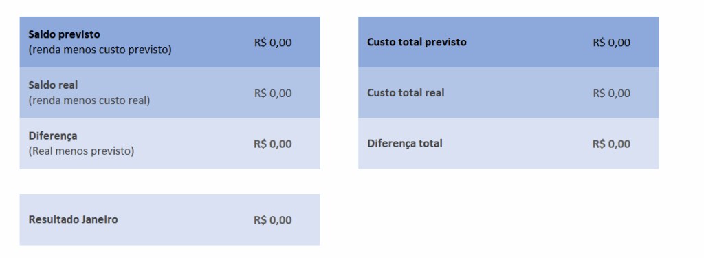 Aqui não será necessário preencher nada. A planilha irá calcular para você quanto projetou de renda, quando recebeu efetivamente de renda, assim como as despesas.