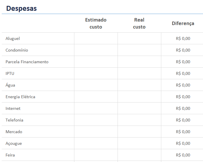 Coloque os custos estimados na primeira coluna e o custo real na segunda.